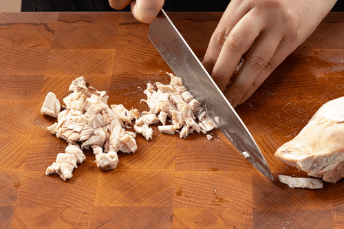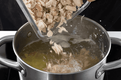 Курицу из бульона вынуть, разобрать: кости выкинуть, а мясо мелко нарезать.