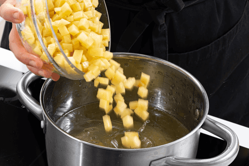 В кипящий бульон добавить нарезанный кубиками картофель, варить 5–7 минут до готовности картофеля.