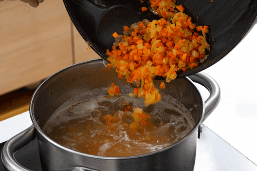 Добавить тушеные овощи, довести до кипения, а затем снять с огня.