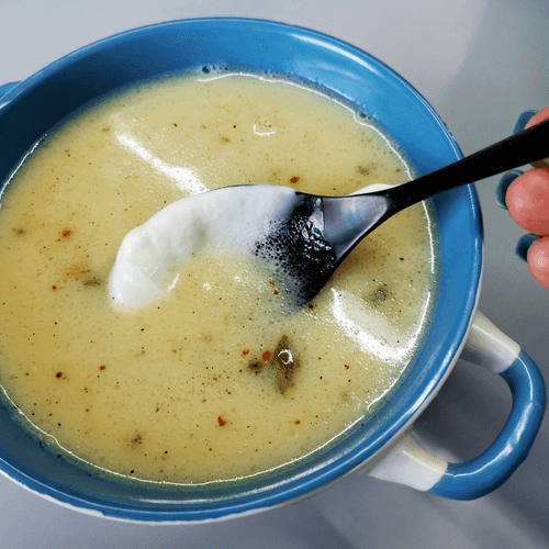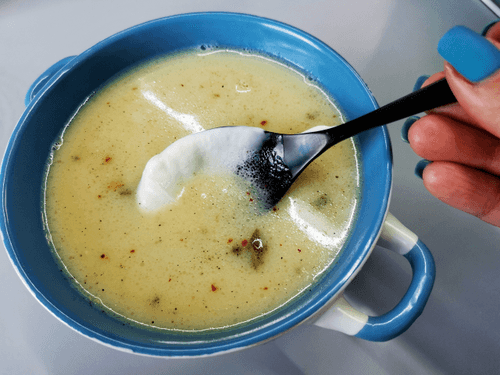 Перелить часть горячих щей в глубокую емкость и вбить в порцию яйцо. Перемешивать в течение 30 секунд.