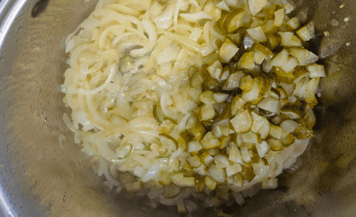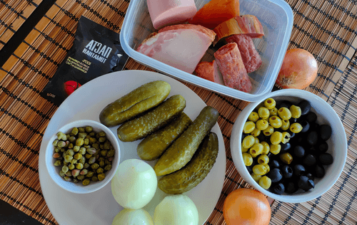 Подготовить все основные ингредиенты (маринад от оливок, маслин, каперсов и огурцов сохранить, он понадобится).