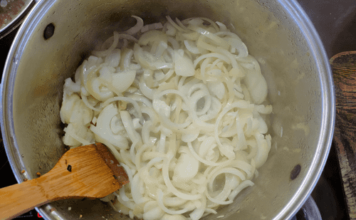 На растительном масле обжарить лук сразу в кастрюле, в которой будет вариться солянка. Жарить можно на сильном огне около 5–7 минут.