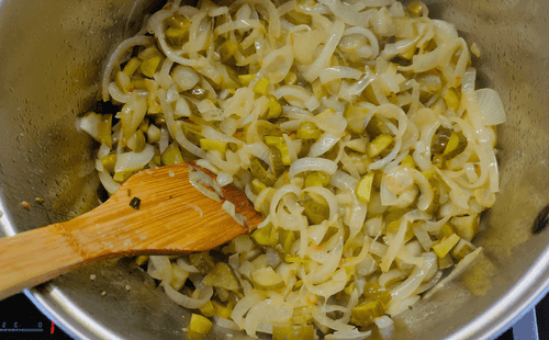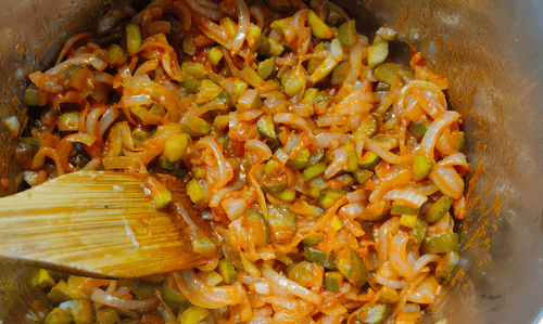 Когда лук станет прозрачным, в кастрюлю высыпать огурцы.