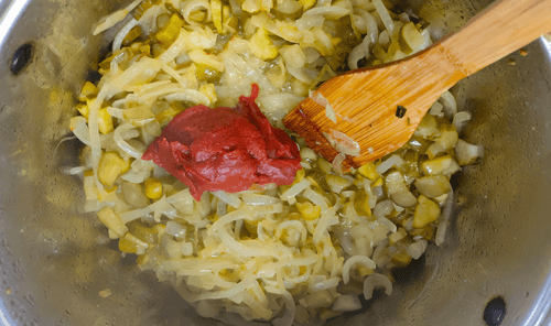 В тушеные овощи положить томатную пасту.