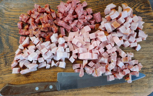 - Копченая колбаса: 150 г