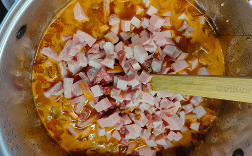 Добавить нарезанные мясо и колбасу к овощам.