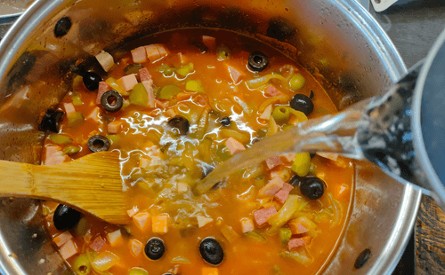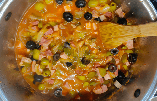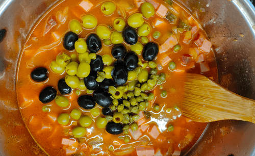 Выложить маслины в кастрюлю и влить оставленный рассол от огурцов и оливок, маслин и каперсов, все перемешать и протушить вместе 5–7 минут.