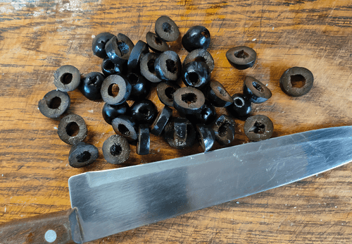 Оставшиеся маслины нарезать колечками.