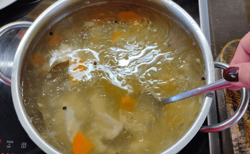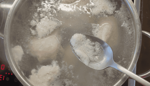 После закипания снять пену с бульона, убавить огонь до среднего.
