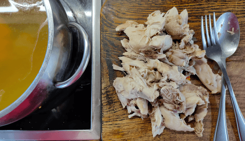 После того как курица будет готова, вынуть ее и разобрать от костей, нарезать небольшими кусками.