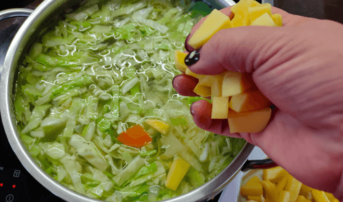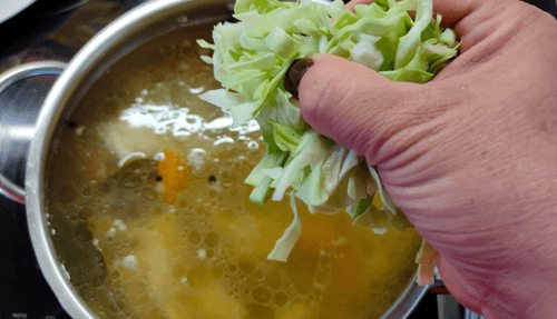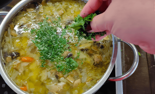Добавить зелень в готовые щи, оставить на 5 минут закипеть всему вместе.