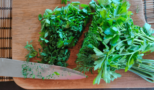 Тем временем нарезать мелко зелень. Оставить немного для подачи.