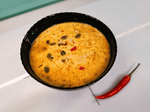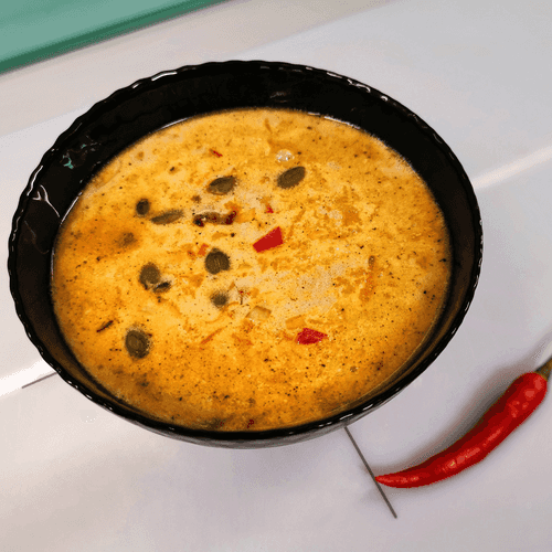 Согревающий тыквенный суп – это настоящая осенняя гармония вкусов, вдохновленная французской кулинарной традицией. Бархатистая текстура и нежный сладковато-пряный аромат делают его идеальным для уютных вечеров. Запеченная тыква наполняется ароматами розмарина и тимьяна, а кокосовое молоко и сливки придают супу нежность. Имбирь и галангал добавляют согревающую пикантность, а чеснок и лук – глубину вкуса. Этот суп не только вкусный, но и полезный – богат витаминами и антиоксидантами. Он идеально сочетается с хрустящим багетом или ржаным хлебом. Сервировка с тыквенными семечками делает его еще более привлекательным, подчеркивая сезонность блюда. Идеальный выбор, чтобы согреться в прохладный день и насладиться гармонией природы и кулинарного мастерства!
