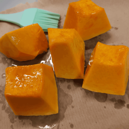 Тыкву выложить на противень и смазать оливковым маслом (1,5 ст. л) со всех сторон.