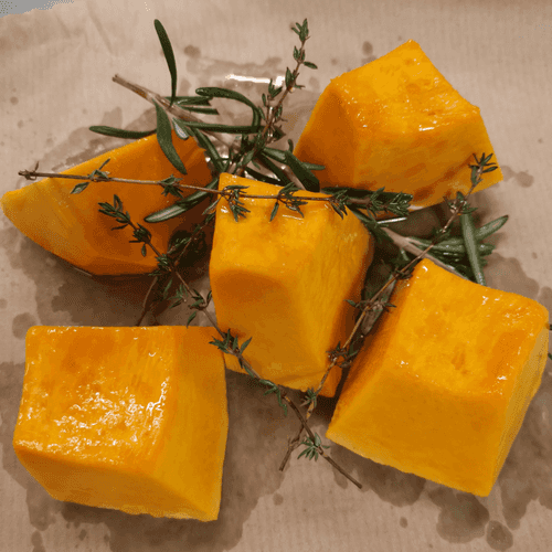 Добавить розмарин и тимьян. Отправить тыкву в духовку при 200 градусах на 30 минут.