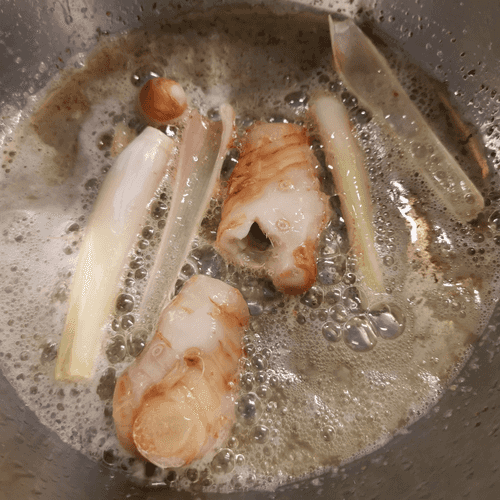 В глубокой кастрюле растопить сливочное и оливковое масло (1 ст. л) и добавить к ним галангал и лемонграсс. Обжарить их до румяной корочки на не самом сильном огне и изъять из масла.