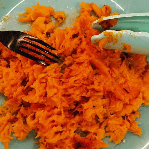 Приготовленную тыкву переложить на тарелку и прочесать вилкой, создавая волокна.