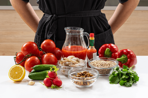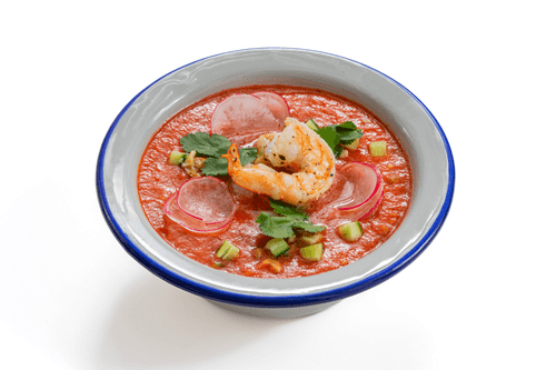 Этот авторский холодный суп с чечевицей, орехами и редиской — настоящая симфония вкусов и текстур. Его основа — пюре из свежих помидоров и сладкого перца, дополненное пикантными нотами лимонного сока и табаско. Нежная чечевица придает супу сытность, а грецкие орехи добавляют хрустящую текстуру. Свежие огурцы и редис обеспечивают приятную свежесть, а тигровые креветки, обжаренные с чесноком, наполняют блюдо морским ароматом. Украшенный кинзой, этот суп идеально подходит для летних дней, когда хочется чего-то легкого и освежающего. Его можно подать как оригинальную закуску на ужин или легкий обед, который зарядит энергией и порадует необычным сочетанием ингредиентов.