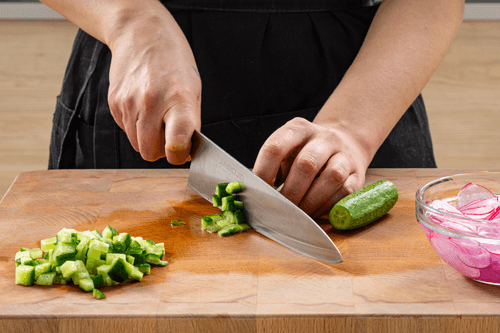 Нарезать огурцы мелкими кубиками, а редис тонкими ломтиками. Положить редис в холодную чистую воду.