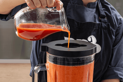 Крупно нарезать помидоры и сладкий перец. Измельчить в блендере с томатным соком.