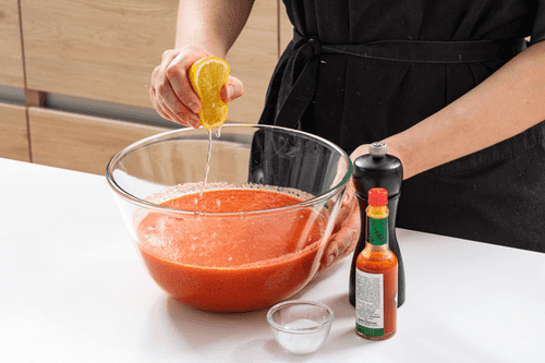 Попробовать смесь и добавить соль, лимонный сок и табаско по вкусу. Перемешать.