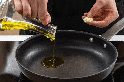 В сковороде разогреть оливковое масло, бросить туда раздавленный очищенный зубчик чеснока.