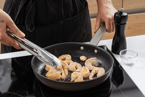 Очистить креветки и добавить их в сковороду. Обжаривать по 1 минуте с каждой стороны. Посолить и поперчить.