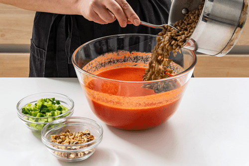 Залить готовую чечевицу овощным пюре, добавить огурец и толченые грецкие орехи. Если суп получился слишком густым, добавить еще томатного сока.