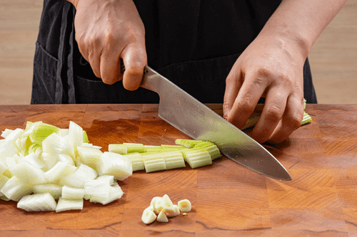 Так же произвольно нарезать лук, сельдерей и чеснок.