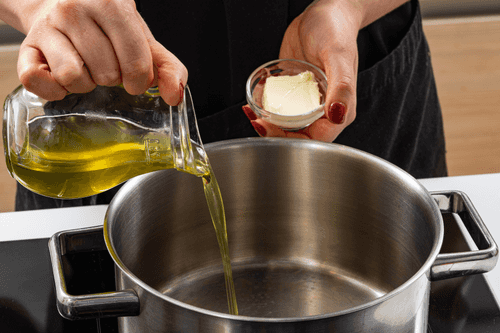 В кастрюле с толстым дном разогреть смесь оливкового и сливочного масла.