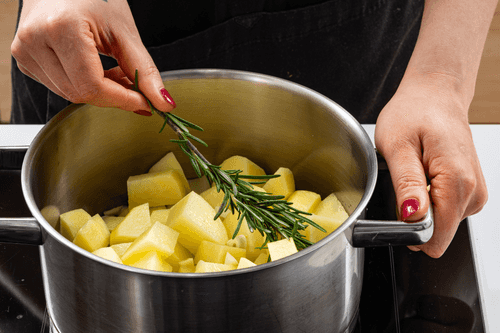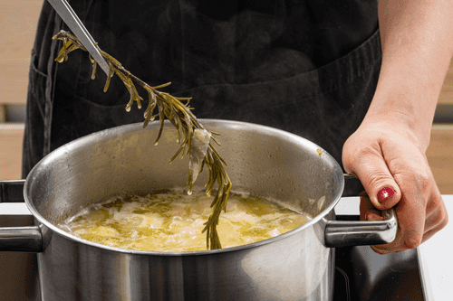 Пассеровать нарезанные овощи с веточкой розмарина.