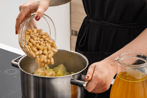 Добавить фасоль из банки вместе с жидкостью, добавить бульон, чтобы довести суп до нужной консистенции. Варить суп до мягкости овощей.