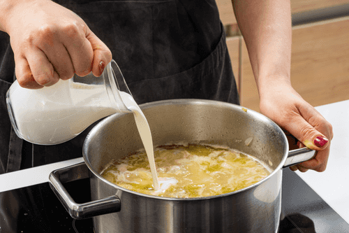 Добавить сливки и пробить суп блендером до состояния пюре.