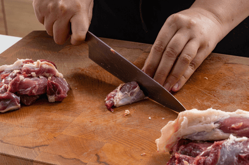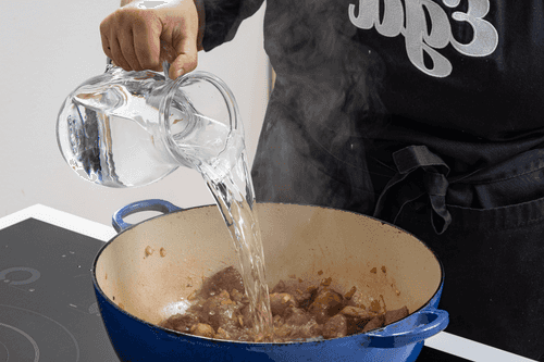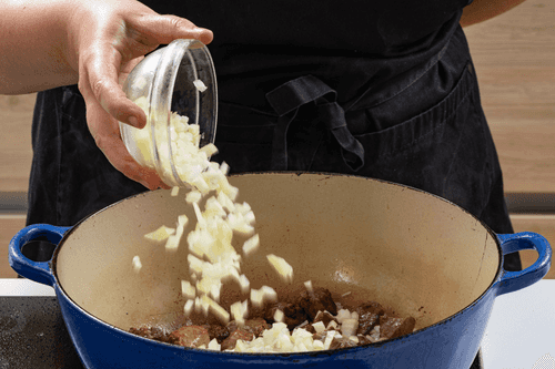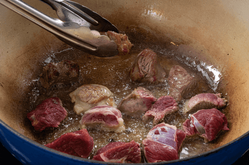 Обжарить мясо в толстостенной кастрюле или казане на растительном масле. Лучше обжаривать частями, чтобы получить золотистую корочку.
