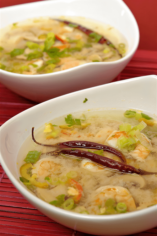 Тайский суп с креветками и овощами — это истинное воплощение гармонии вкусов, сочетающее в себе богатый аромат морепродуктов, пикантные специи и свежесть овощей. Этот суп берет свое начало в традиционной тайской кухне, где каждая деталь продумана для создания глубины вкуса. Сушеные креветки, смешанные с луком и черным перцем, образуют насыщенную основу, которая плавно сочетается с куриным бульоном и рыбным соусом. Морковь, цветная капуста, цукини и стручковая фасоль привносят яркость и текстурное разнообразие, а свежие креветки добавляют нежность и изысканный вкус. Подается он горячим, с листочками базилика, которые придают ему свежую, пряную нотку. Этот суп идеален как легкое, но питательное блюдо, придающее ощущение уюта и наслаждения с каждым глотком.