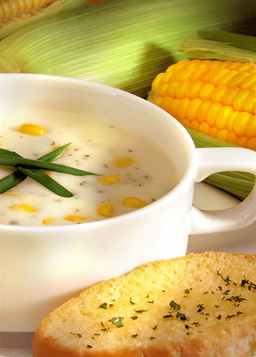 Лук и чеснок очистите, нарежьте крупными кусками и отварите в воде с ароматными травами (базилик, эстрагон) в течение 10 минут. Извлеките лук, чеснок и травы из кастрюли, поместите все это в кухонный комбайн вместе с отваренной кукурузой, измельчите до состояния однородной массы и соедините с куриным бульоном, оставшимся после варки кукурузы.