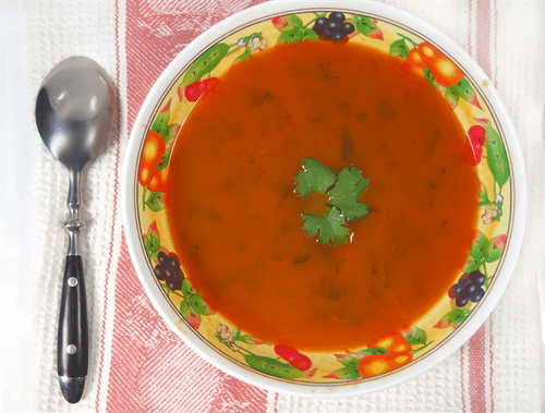 Снимите суп с огня, дайте ему остыть и поместите в холодильник на час. Перед подачей на стол положите в каждую тарелку ложку йогурта, разлейте суп и украсьте сверху долькой апельсина.