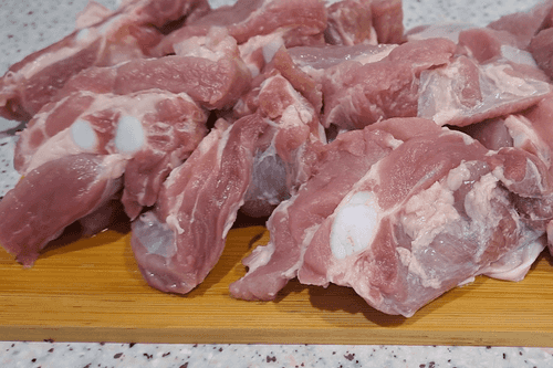 Свиные ребра хорошо вымыть под проточной водой и нарезать порционными кусками.