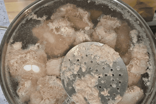 Переложить нарезанные свиные ребра в кастрюлю, залить водой, добавить 1 столовую ложку соли, довести до кипения, периодически снимая всю пену. Добавить лавровый лист. Убавить огонь и варить на медленном огне примерно 40 минут.