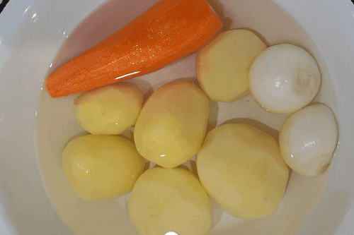 Очистить лук, картофель и морковь.