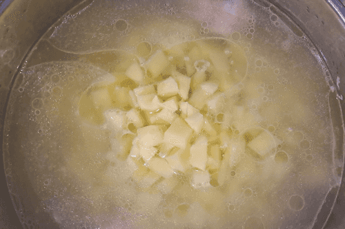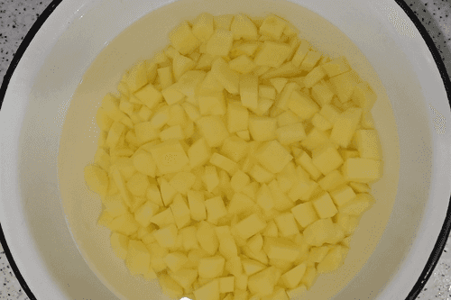 Картофель нарезать небольшими кубиками, залить водой и отставить в сторону.