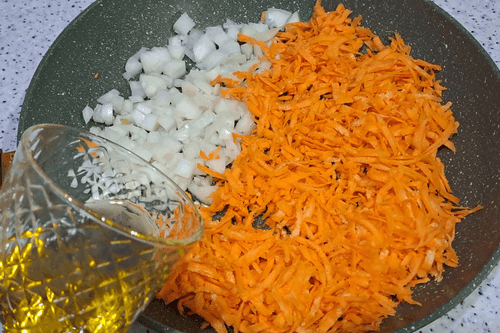 Выложить морковь и лук на сковороду, добавить 150 мл подсолнечного масла и жарить до золотистого цвета.