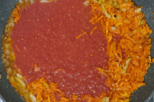 К готовому луку и моркови влить 1 литр густого томатного сока. Тушить еще примерно 10 минут.