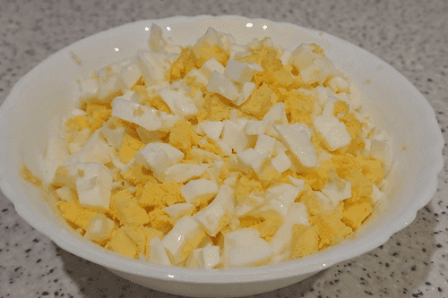 Отварить в подсоленной воде куриные яйца. Очистить, остудить и нарезать мелкими кубиками.