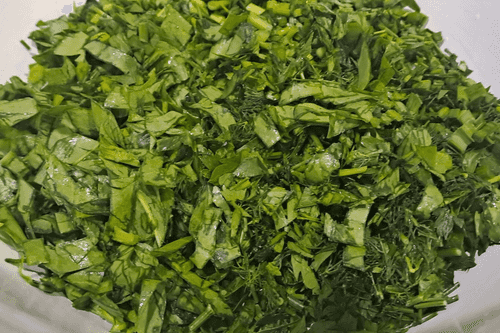 Хорошо вымыть под проточной водой и мелко нарезать щавель, петрушку, укроп.