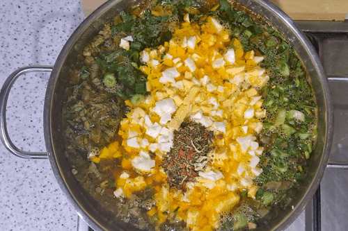Когда картофель уже готов, добавить в кастрюлю лук и морковь, протушенные с томатным соком на сковороде. Выложить нарезанную зелень, яйца. Добавить приправы для супа по вкусу.