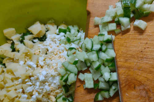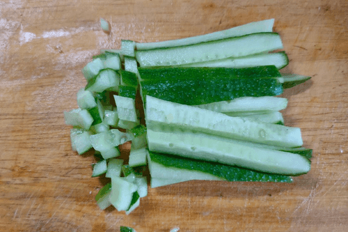 Огурцы нарезать соломкой, затем кубиками.