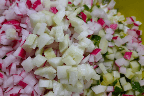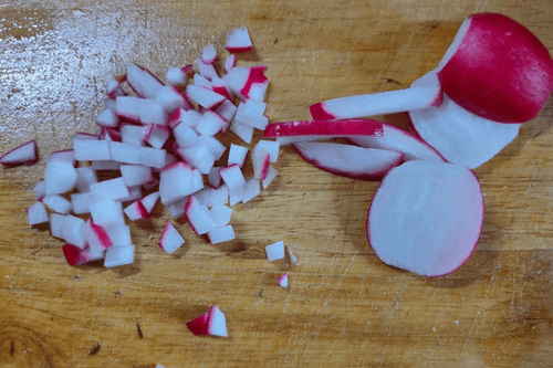 Нарезать редис сперва кружочками и соломкой, затем кубиками.