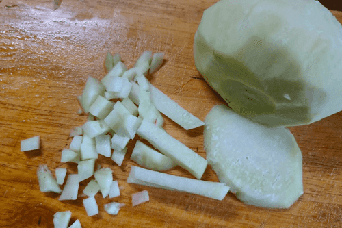 Кольраби очистить и так же нарезать: сперва кружочками, затем соломкой и кубиками.