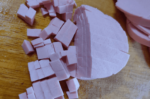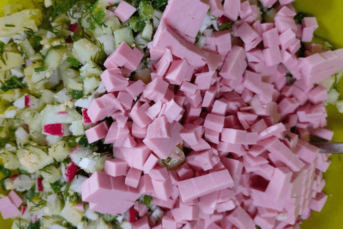 Колбасу нарезать кружочками, соломкой и затем кубиками.